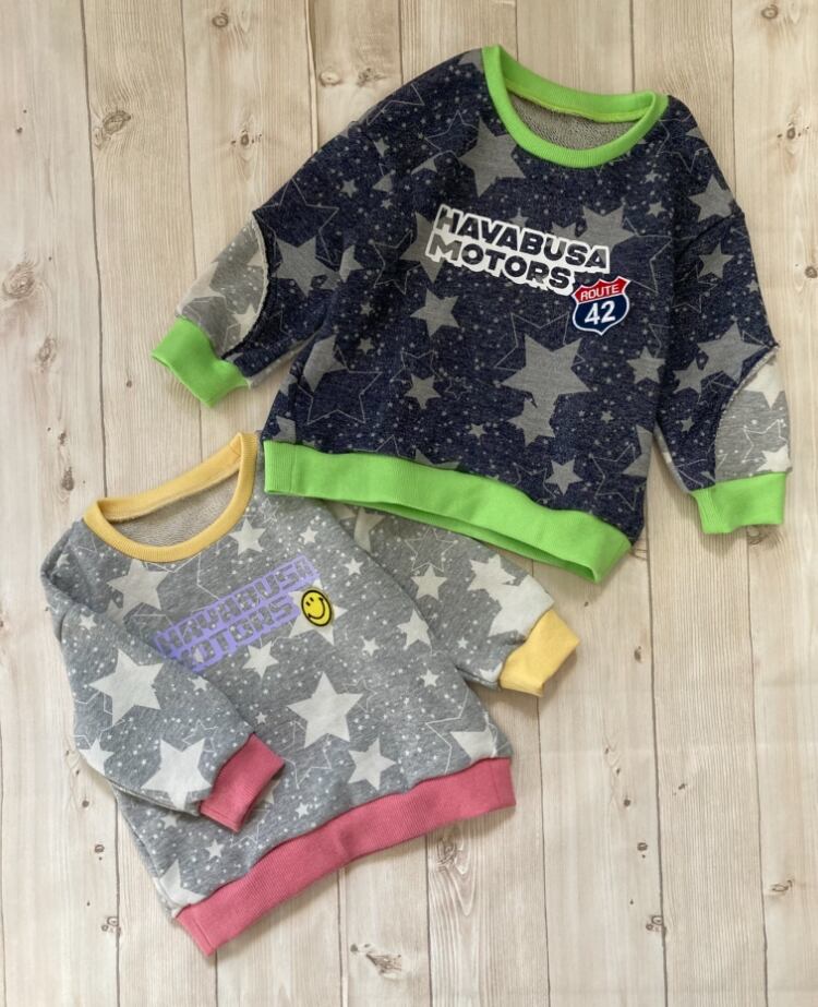 作例は小サイズを、Aはネイビーのトレーナー100サイズに、Bはグレーのトレーナー90サイズに貼り付けています。